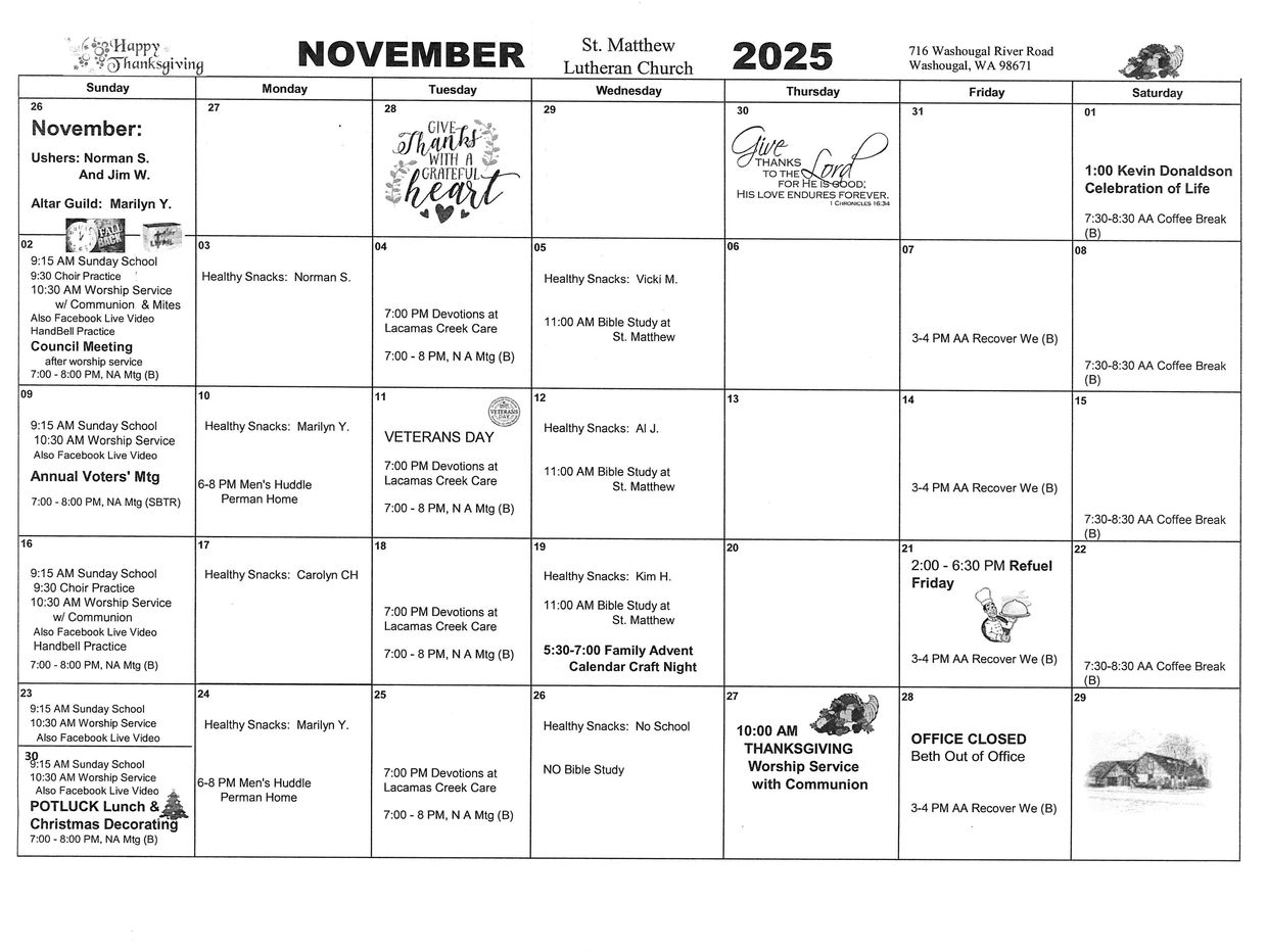 The worship service will also be broadcast live at 10:30 a.m. on Facebook live (https://www.facebook.com/st.mattsLC/) or you can watch the video after it is over and been uploaded. The order of worship is found in the photo gallery under "Sunday Message."